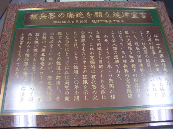 この事件は、焼津の遠洋マグロ漁船第五福竜丸の乗組員が、マーシャル諸島ビキニ環礁でアメリカが行った水爆実験に遭遇し、死の灰を浴び犠牲性者となった事件です。放射能を浴び亡くなった無船長久保山愛吉氏は、平和時での核の最初の犠牲者と言われています。1951年3月1日の事でした。