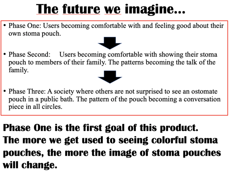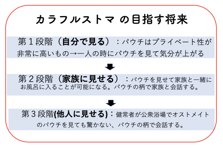 カラフルストマを通じて、最初の目標は自分で見て気分が上がること、ですが最終的には20万人以上いるオストメイトの方々が社会的に広く認知され、気兼ねなく周囲の人とパウチについて会話できるような社会を目指していきたいと思います。
