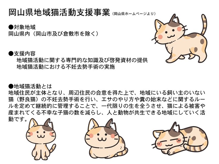 地域住民が主体となり、周辺住民の合意を得た上で、地域にいる野良ネコの不妊去勢手術を行い、エサのやり方や糞の始末などルールを定めて継続的に管理し、一代限りの生を全うさせ、ネコによる被害や産まれてくる不幸な子ネコの数を減らし、人と動物が共生できる地域にしていくための「地域猫活動」を、私たち一般社団法人 岡山県地域猫活動の会は、全面的にサポートします。特に、地域ネコに対する岡山県動物愛護センターの行政サービスである不妊去勢手術を、地域ネコがスムーズに受けられるよう、全面的にサポートします。