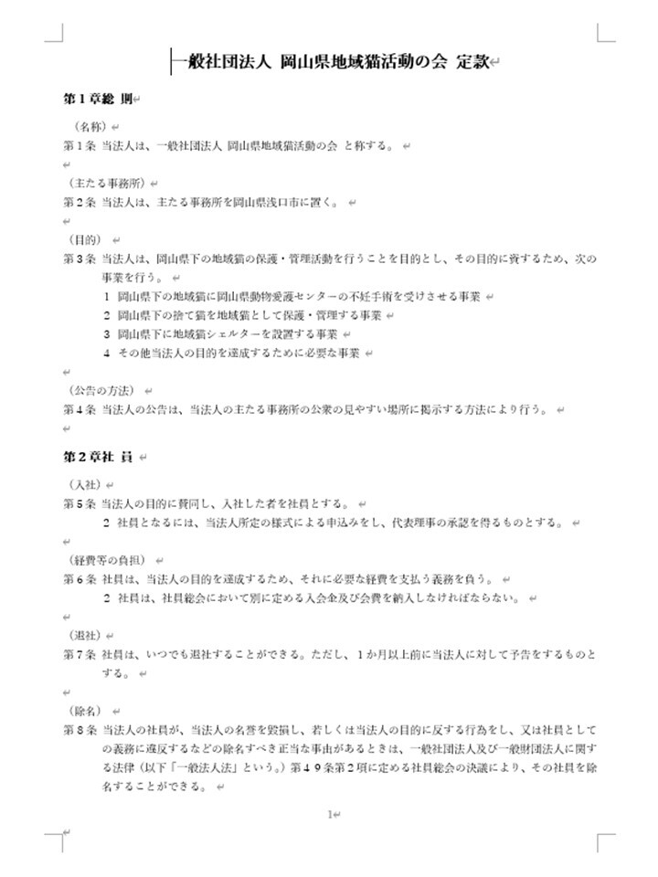 ◆「一般社団法人岡山県地域猫活動の会」定款