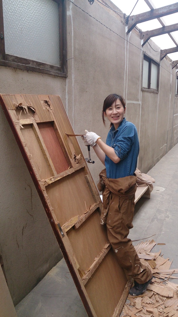今日、お邪魔したら古くなったトイレ扉のベニヤ板を剥がしているところでした!