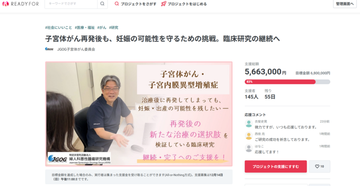 そこで、臨床試験によってその有効性、安全性を調べ、論文化することで将来の妊娠を希望する子宮体がん再発患者さんの選択肢を拡げ、その後の妊娠も可能にしようと慶應義塾大学の山上亘教授を中心に研究がおこなわれてきました。あと1年で研究が終了という段階になって継続するための費用が足りなくなってきた--ということで、このたびクラウドファンディングを実施されています。