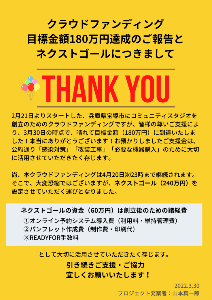 目標金額180万円達成の感謝報告とネクストゴールにつきまして