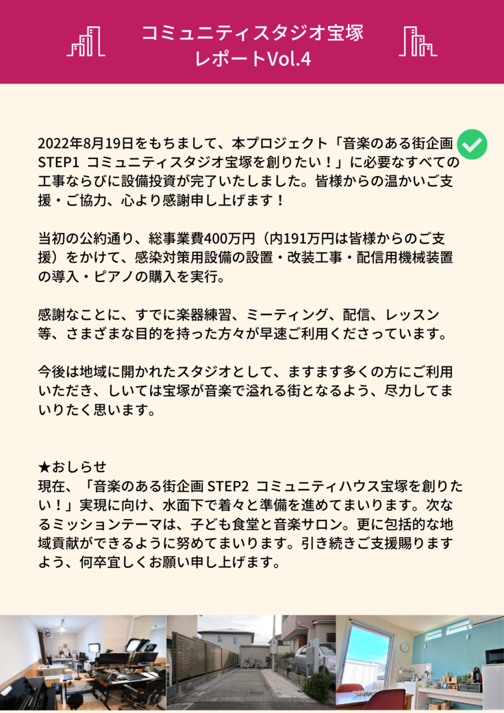この度は本プロジェクトにご支援・ご協力いただき、本当にありがとうございました!レポートにも書かせていただきましたが、現在、次のミッションであるコミュニティハウス創立に向けて、水面下で着々と準備を進めております。テーマは、ずばり「子ども食堂と音楽サロン」。子どもたちからお年を召した方まで、世代を越えた交流の場の実現を目指します。その節は、何卒ご支援のほど宜しくお願い申し上げます。