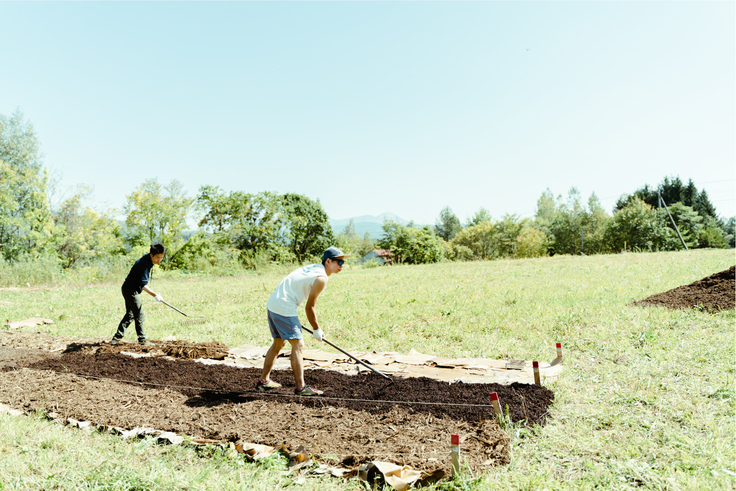 敷地内の畑作りにも、町内に住むパーマカルチャーガーデンデザイナーの方や、1ヶ月コースの参加者と一緒に、本格始動に向けての土壌作りを進めています。