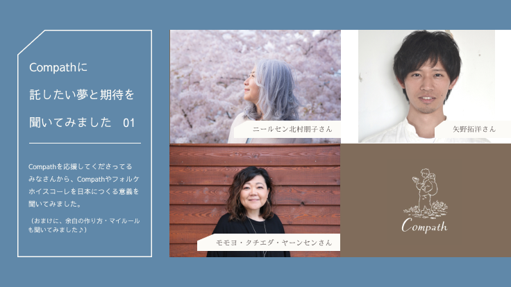 さて本日は、第一線で活躍する応援者のみなさんに聞いた「Compathやフォルケを日本につくる意義」を紹介します。今回のクラウドファンディングに合わせて、それぞれの「余白の作り方・マイルール」も聞いてみたので、ぜひ参考にしてみてくださいね。