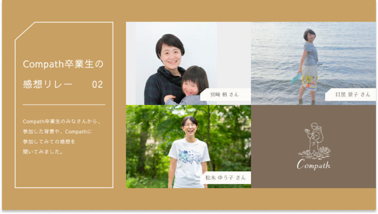 さて本日は、卒業生感想リレー2回目!過去開催したCompathのコースに参加してくれた卒業生から、参加した背景や、コース中印象的だったことを聞いてみました。子育てをしながらコースに参加してくれた、ママさん3人の体験談です。