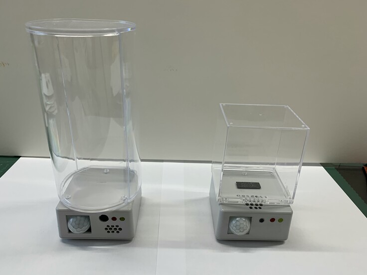ケースの中に置くことで、よりソフトに見せる事が出来き無用なトラブルを防ぎます。また警告音が流れる事で他の客からの視線が集まり、それも行動変容へ繋がります。全国の飲食店では店側の対策も限界がある事から、今後は客の行動変容が求められるため、感染防止対策製品として普及するものと確信しております