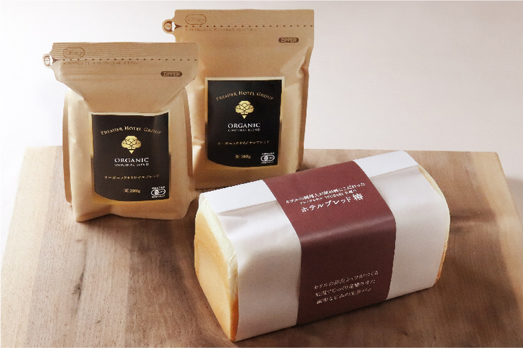 ホテルの調理人が原材料にこだわった「ホテルブレッド椿」と、深入りした中南米産のアラビカ種を中心に有機JAS認証農園産コーヒーのみを配合し、程よい苦みとコクのあるバランスがとれた味わいのコーヒーのセットです。