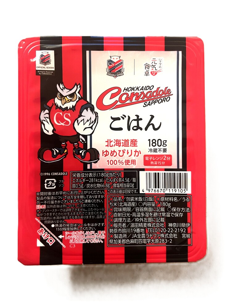 北海道産ゆめぴりか100%を使用した1パック180gのパックご飯、釜でふっくら、ガス直火炊きのこだわり製法となっております。電子レンジ2分で手軽に食べれる「コンサドーレごはん」を是非お召し上がりください!