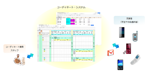 (コーディネート・システムの模式図: Google Appsのスプレッドシートを利用しています。見た目はエクセルのような画面ですが、ここから直接メールの送信や回答の受信などができます!)