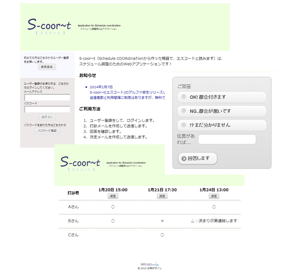 S-coort~t(エスコート)は、皆で集まる日の日程調整を行うためのWEBアプリケーションです。複数の人にスケジュール確認のメールを同時に送信して、その回答を一覧で表示し、決定連絡のメールを一斉に送ることができます。インターネットとブラウザさえ利用できる環境であれば、パソコン、スマートフォンからご利用いただけます。以下のURLからアクセスできます。