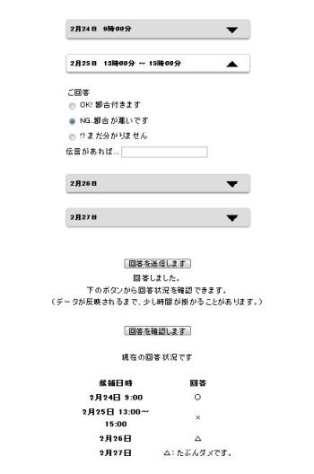 一方のエスコートは、URLをクリックすると、次のような画面が出てきて、複数の日時の回答を一回で答えられるようになっています。