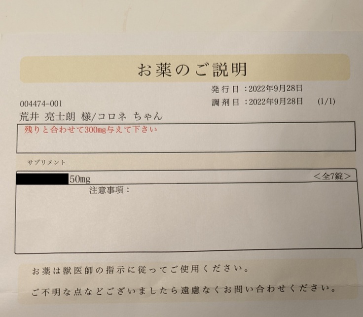 病院に連絡を行ったところ、さらに投薬量を増やすとお話がありましたので、追加の50mgをもらってきました。