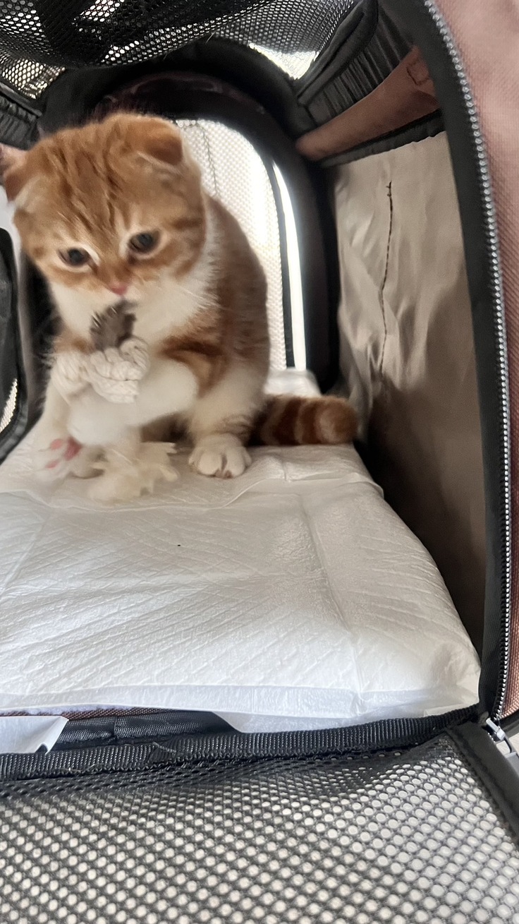 病院に行くためのキャリーにオモチャを持ち込むコロネ