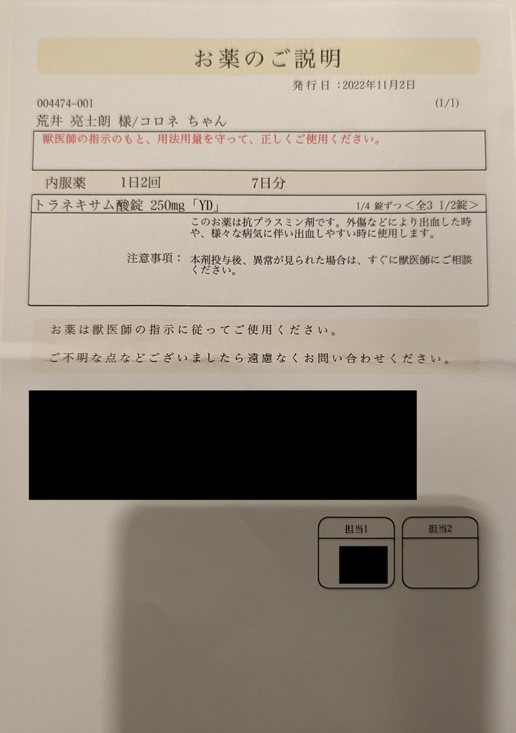 体重は2.40kgと増加しましたが、まだ350mg/日(200mg+100mg+50mgの3錠、4日分)の受領となりました。