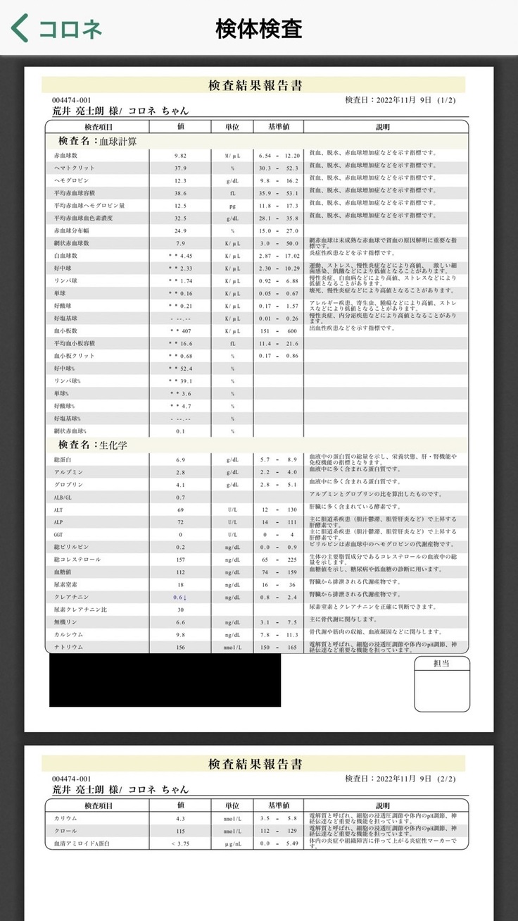 また、血液検査も行い、すべて正常範囲値との結果も頂いています。