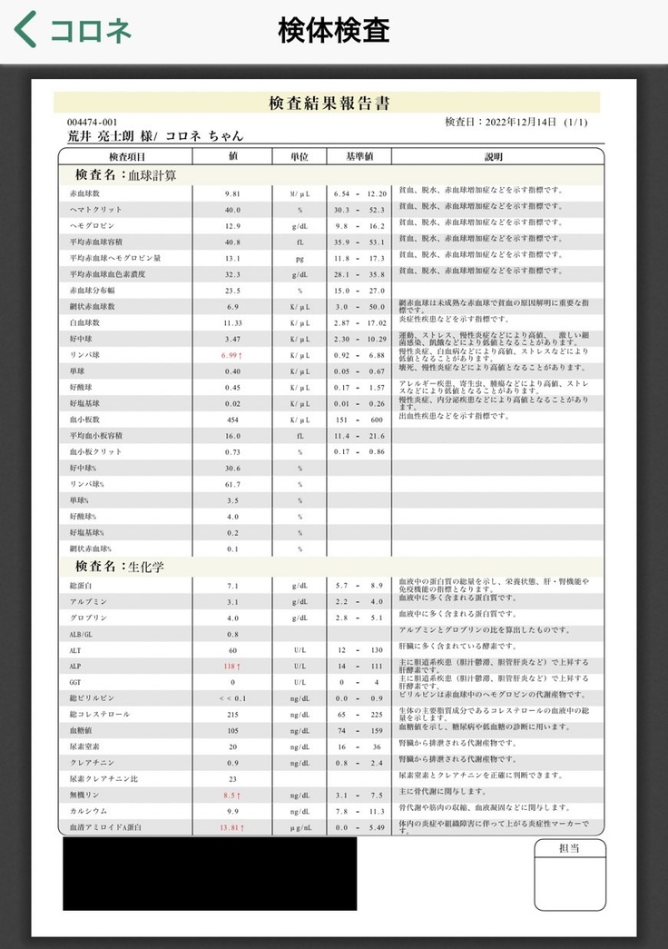 血液検査では特に大きな問題はありませんでしたが、最下部の炎症の項目だけ少し値が大きくなっていました。