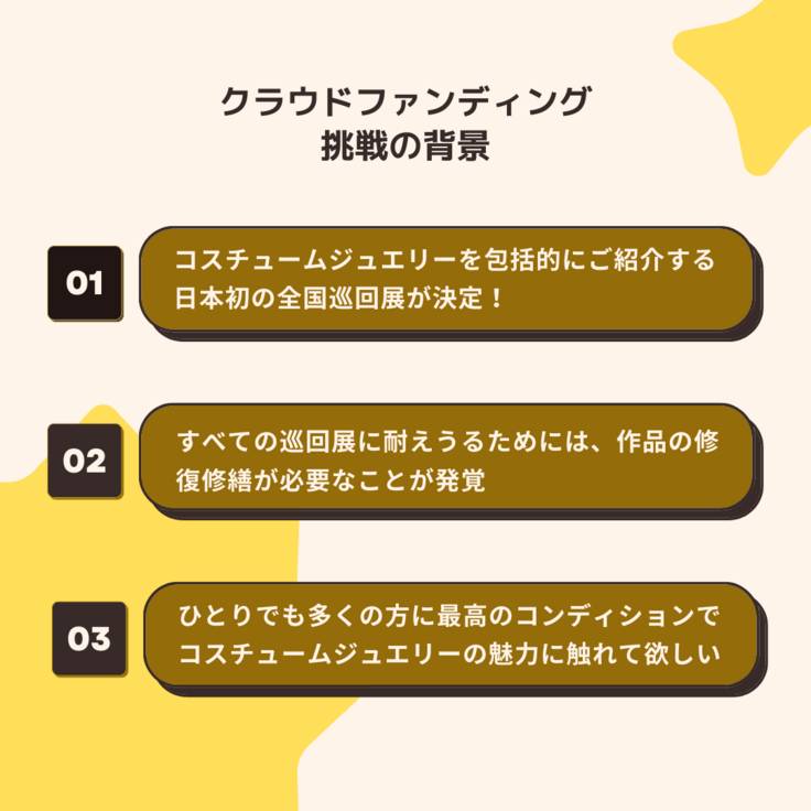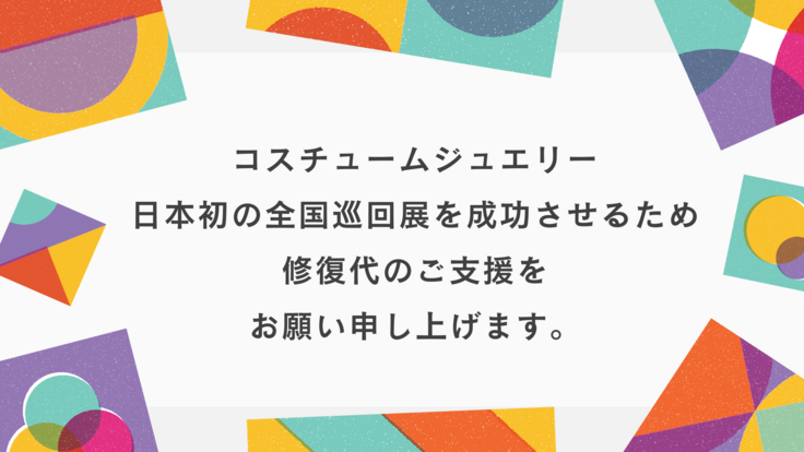 そこで今回、レディーフォーさんを通して、皆さまに修復、メンテナンス費用の一部をご支援いただき、同時にコスチュームジュエリーと展覧会のことを1人でも多くの方に知っていただきたいと考え、本プロジェクトを立ち上げるにいたりました。