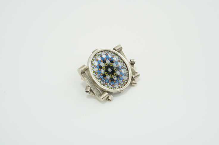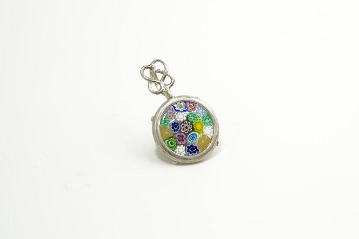 本展監修者 小瀧千佐子と熊本在住の彫金作家 小西翔子先生のコラボレーションで実現したオリジナルコスチュームジュエリー。ムラーノガラスの伝統技法ムリーネのプレートが小西先生の彫金技術で愛らしいながら気品漂うペンダントへ生まれ変わりました。ムリーネプレートも1枚1枚手づくりされていますので、限定1点でのご案内です。