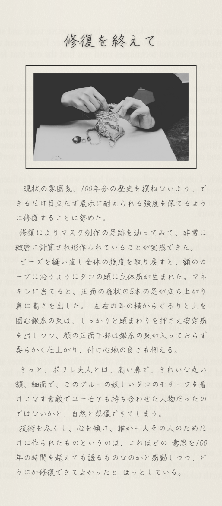 1年以上の時間をかけ、無事に修復を終えた安堵感と、作品と職人さんへの敬意。そしてポワレと夫人への止められない空想と想いが伝わり、私はなんだか目頭が熱くなってしまいました・・・