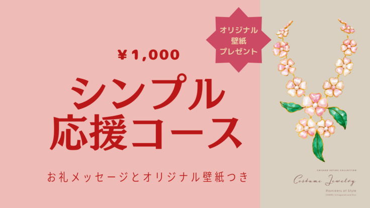 ご支援のお礼として2004年に監修者小瀧千佐子が発行した簡易図録「コスチュームジュエリーの世界」(全P28)をご指定のご住所までお送りします。