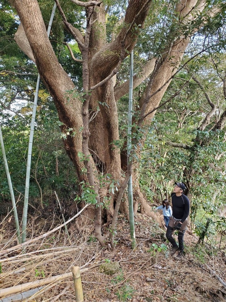 ロゴをお願いされた時、やはり現地を感じたいと思いそれを伝えると、テント泊で自分たちで木の手入れをしているとのこと!水平線を眺めながら到着した先は、海を見晴らせる素敵なクスクスの森でした。そこには首からタオルをぶら下げ額に汗した笑顔の2人。現地を案内してもらう車内で話してくれるのは、真鶴の歴史やオススメスポット。この地へのリスペクトをもって進められていることがヒシヒシと伝わってきました。