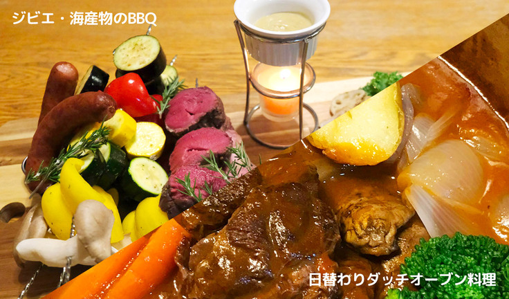 ディナーは、「ジビエ・海産物のBBQ」「日替わりダッチオーブン料理」の2つのメニューから選べます。