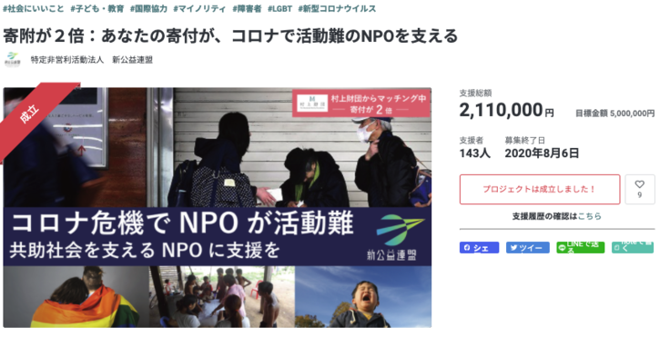 5月よりREDAYFORにて開設いたしました新公益連盟のクラウドファンディングが8月6日をもって終了いたしました。