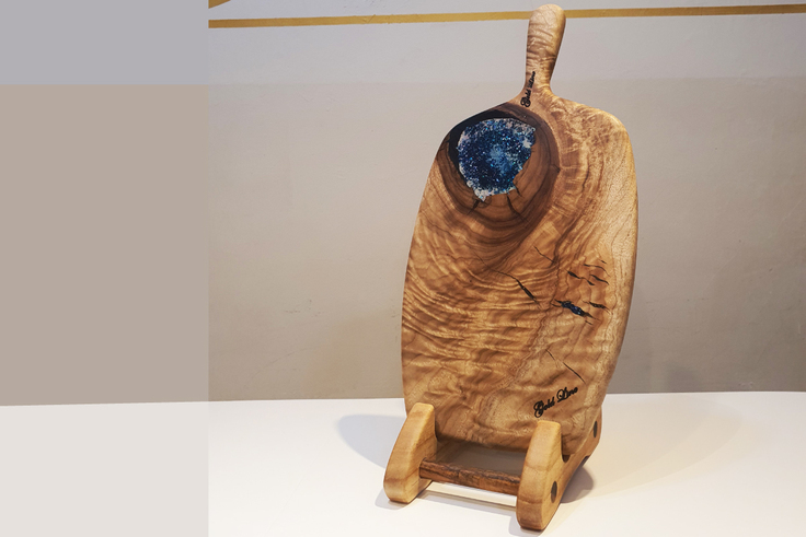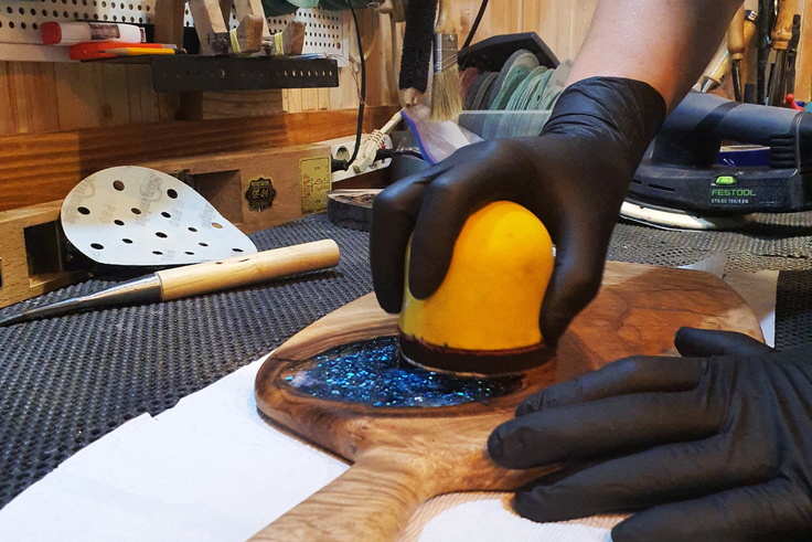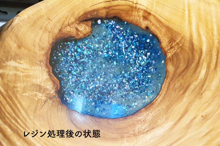 レジンという作業を通して木は、美しく生まれ変わることになります。 木を想う女匠の手によって、人のためになる最高の価値のプレートボード(カッティングボード・トレー)に生まれ変わるのです。