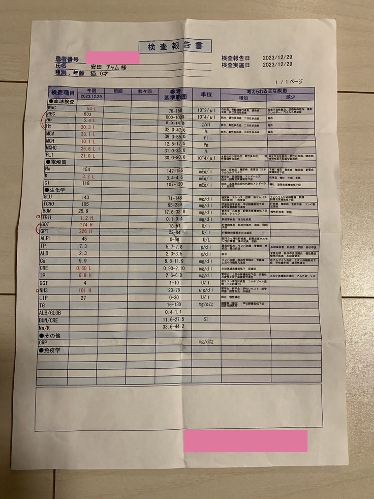 チョコは元々肝臓の数値が少しだけ悪かったのですが、治療するほどではなかったのに、血液検査の結果数値は急激に悪化し、貧血や黄疸の数値も高く、エコーでは腸がガスでパンパンになっててとにかく酷い状態でした。