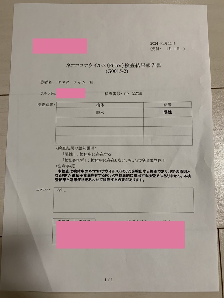 腹水を採取したのが年末で、外注の病理検査に出すのが年始からになり診断書を書いていただいたのが後手後手になりましたが、ほぼFIP確定と診断された時は生後3ヶ月の時でした