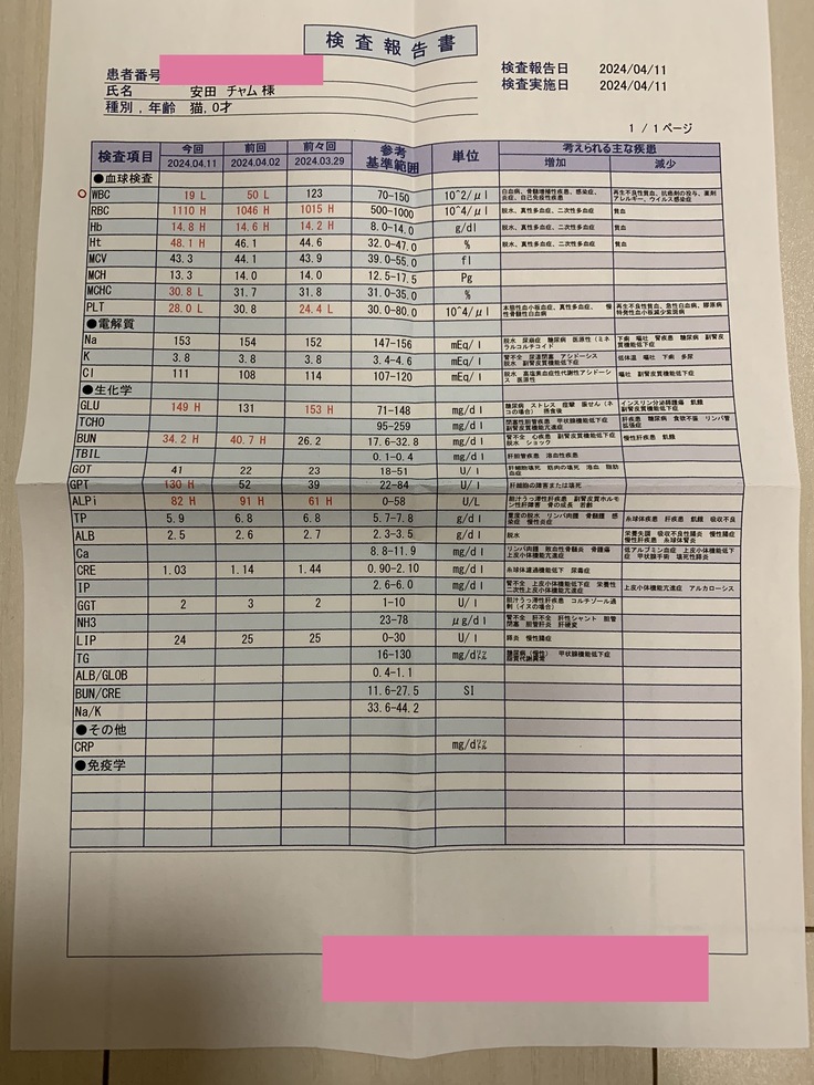 エコー検査は良かったのですが、お熱が39度あり、血液検査の結果は白血球の数値がとても低く先生も心配する値でした