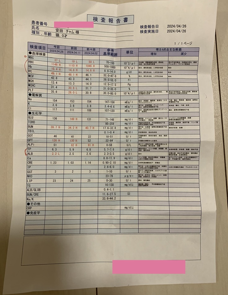 でもこれぐらいなら許容範囲なのでFIPのお薬は今の用量で継続しても大丈夫だろうとのことです