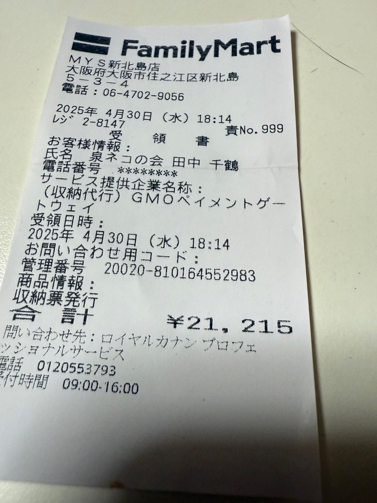 今月も領収書の一部ですが、報告させて頂きます。