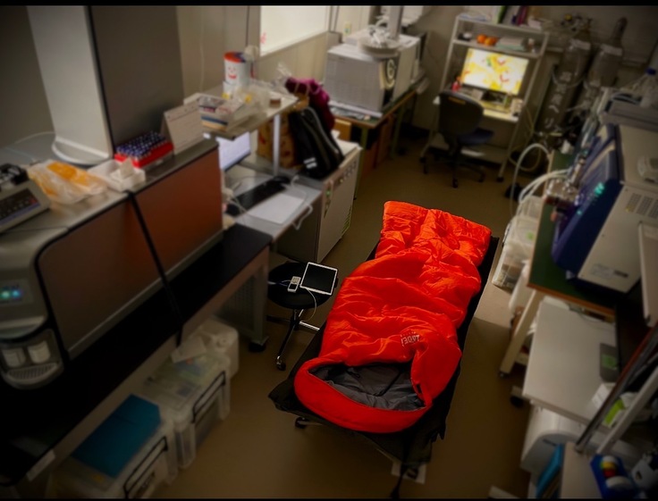 中毒患者さんにオンコールで対応した喜屋武玲子講師にとって、薬毒物の貴重な情報を提供してくれる愛すべき分析機器に囲まれた仮眠は最高みたいです!