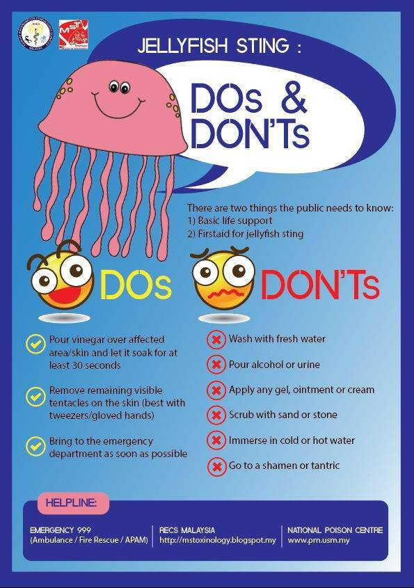 このポスターはハブクラゲ属のクラゲの触手が絡みついた際のDo & Don’tを示しています。マレーシアのAhmad Khaldun Ismail教授からいただきました。