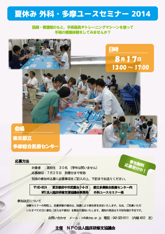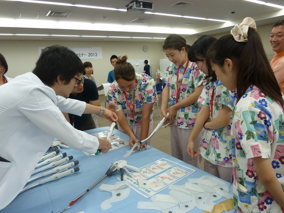私たちは高校生を対象に外科医の仕事を体験する「外科ユースセミナー」を開催しています。手術で使用する機材を使った縫合、食肉を使用した電気メス、シミュレータを用いた腹腔鏡術、専用機材など実際に触れて使用できる体験学習です。4,5人の小さなグループとなって各ブースを回り、現役の外科医と看護師などの専門スタッフが個々に対応します。毎年抽選のうえ、20~30人の将来医師を目指したいという進路志望、医療現場に興味のある生徒のみなさんにご参加いただいています。