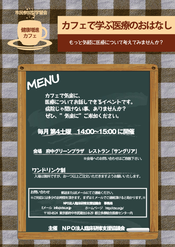 カフェで気軽に、 医療についてお話しできるイベントです。医療者や患者といった枠を取っ払い、病院じゃ聞けない事、ご自身の体験など、参加している皆様で作る交流の場です。お茶を飲みながら雑談する話から実際に起きている身の回りの医療の相談まで幅広く、参加者次第で変化します。