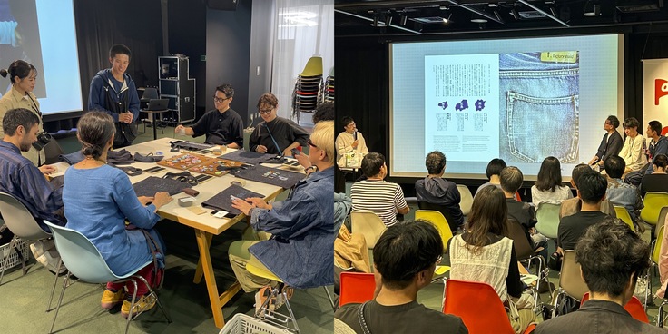 第1部のワークショップでは、講師に福山市でデニム産地の魅力を発信する「デニムのイトグチ」の湯浅遼太さんを招き、「色落ちこそデニムの最大の魅力」ということを学び、体験。