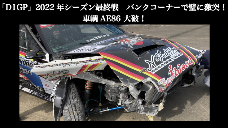 私が今回のクラウドファンディングを立ち上げたきっかけは、「D1GP(D1グランプリ)」2022シーズンの最終戦「エビスサーキット」の前日練習走行の際に、初めて走るバンクコーナーで車輌コントロールを失い、右フロントから壁に激突してしまい車輌を大破してしまいました。