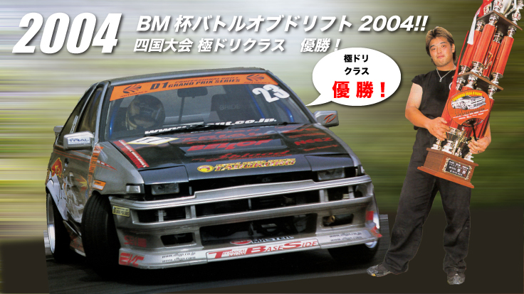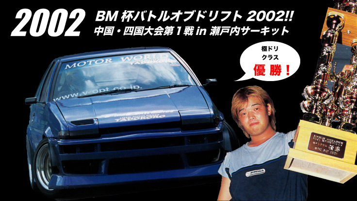 負けず嫌いの性格もあり、誰にも負けたくない!「瀬戸内海サーキット」で1番になる!という強い気持ちで23歳の時に「BM杯バトルオブドリフト 中国・四国大会」で優勝することが出来ました。