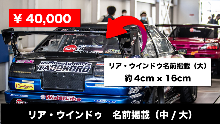田所選手の2023シーズンD1GPで戦う「AE86」車両のリア・ウインドウにお名前掲載プランです。