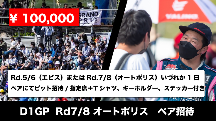 【共に戦おう!D1GP Rd.7/8オートポリス いづれか1日ペアで招待(ピット/指定席)】Tシャツ/キーホルダー/ステッカー付き ¥100,000