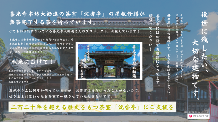 クラウドファンディングが成功し無事に茶室「沈香亭」の屋根修繕が完了できるよう、皆さまからの応援の気持ちを胸に最後まで発信を続けていきたいと思います。