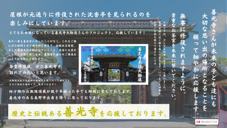 いつも善光寺大勧進を応援くださり、ありがとうございます。現時点で740万円を超えるご支援を、280人以上の方からいただいております。本当にありがとうございます。