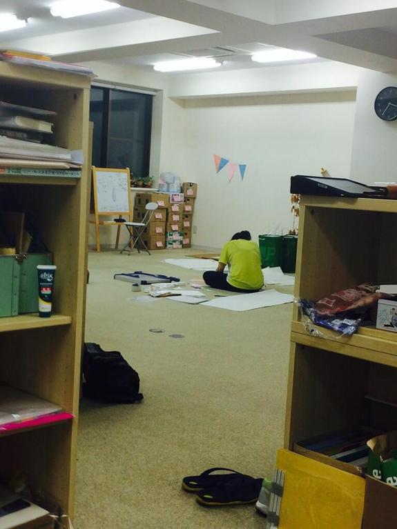これはあっちゃんのデスクから、夜遅くまで手伝ってくれている仲間の背中を撮ったもの。