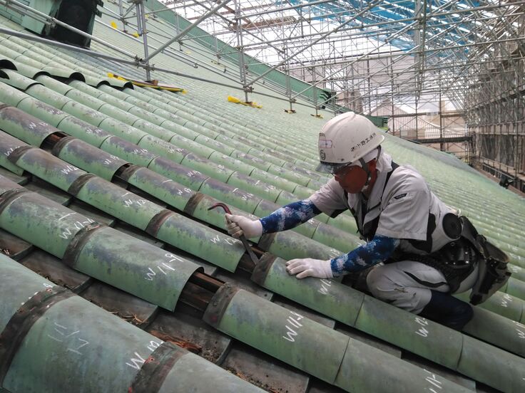 素屋根が完成し雨をしのげるようになった今月、これより銅板瓦の取り外し作業が始まります。