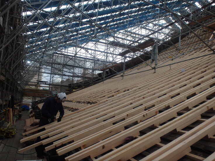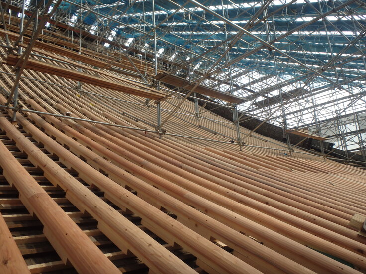 3段目が設置されました。大屋根の反りに合わせて半円の材木を繋ぎ合わせて丸瓦を葺く下地が出来ました。本瓦葺き独特の丸瓦。この部分に皆様から寄進された銅板を取り付けさせていただきます
