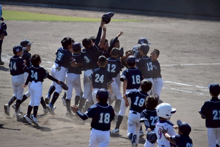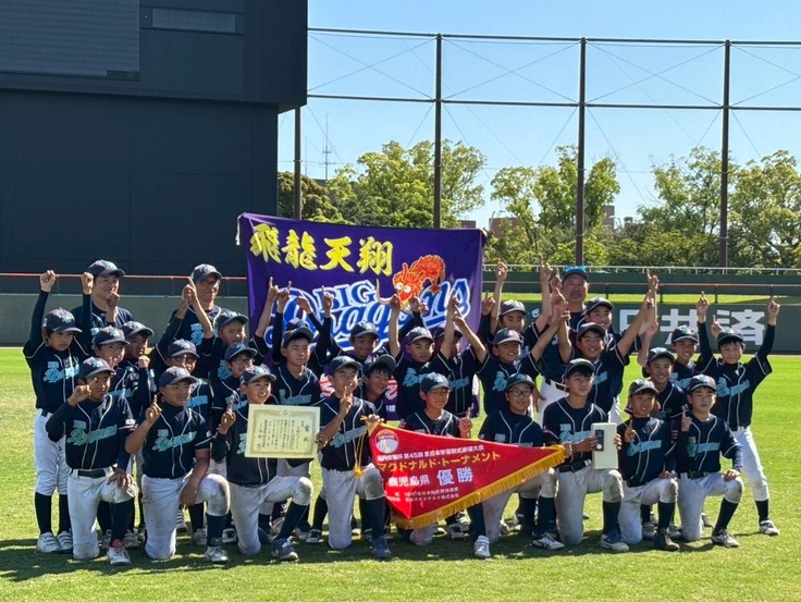 先日、行われた鹿児島県予選では、1回戦11-0、2回戦4-3、準決勝18-0、決勝7-2と、子どもたち一人一人が持てる力を十分に発揮して、見事に優勝を勝ち取ることができました。